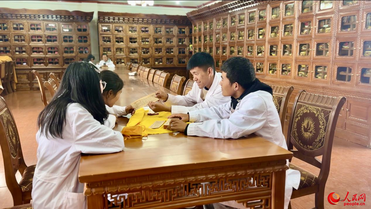 西藏藏醫(yī)藥大學校長米瑪(左三)正在進行授課。人民網(wǎng)記者 次仁羅布攝