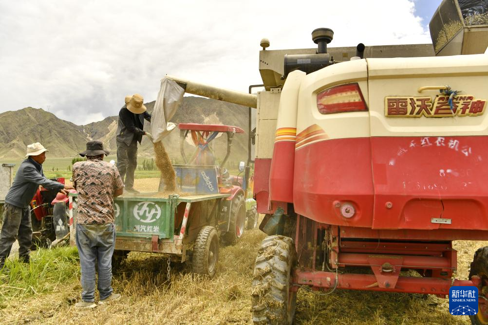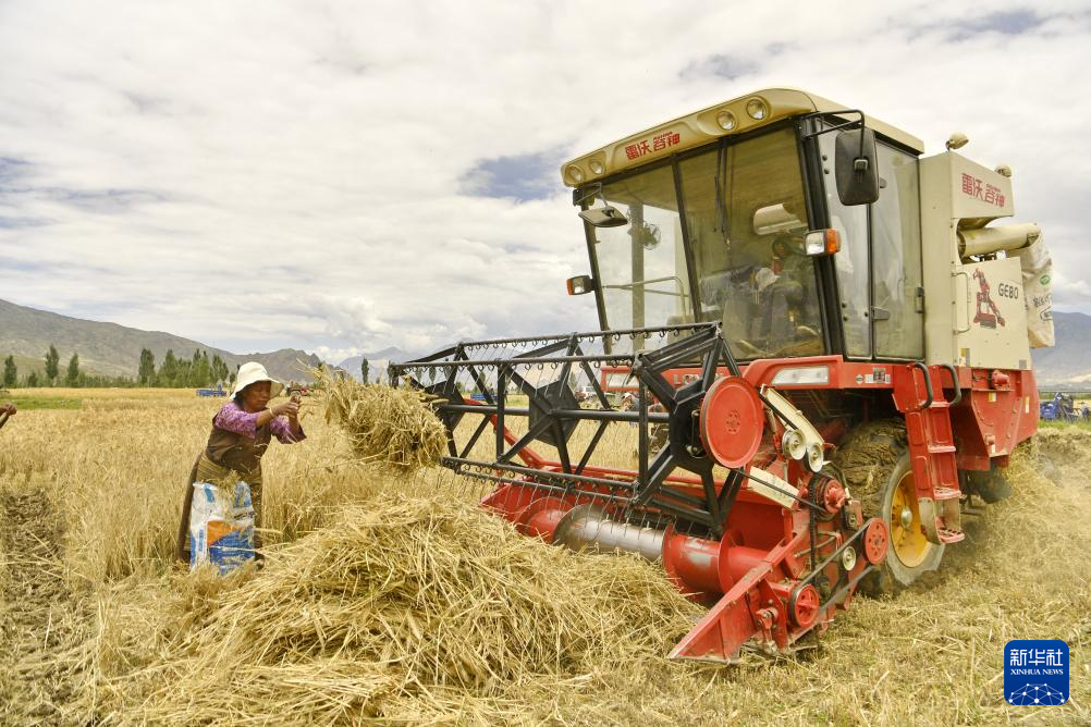 7月31日,聯(lián)合收割機在山南市扎囊縣扎其鄉(xiāng)朗賽嶺村的農(nóng)田里作業(yè)。新華社記者 張汝鋒 攝
