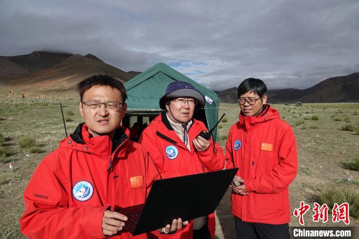 8月8日,珠峰地區(qū)試驗團隊負責人賈立研究員(中)和隊員鄭超磊副研究員(右)、蔣敏助理研究員在試驗場交流,與無人機起降點工作人員聯(lián)系。中新網(wǎng)記者 孫自法 攝