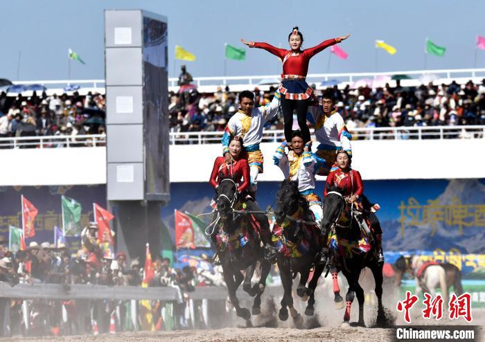 8月10日,2024年那曲恰青賽馬節(jié)暨第三屆“鄉(xiāng)村振興 那曲奮進”活動開幕式在那曲市賽馬場舉行,精彩的文藝歌舞、馬術表演等展示著羌塘草原上的無窮魅力和活力。圖為開幕式文藝表演現(xiàn)場。中新社記者 李林 攝