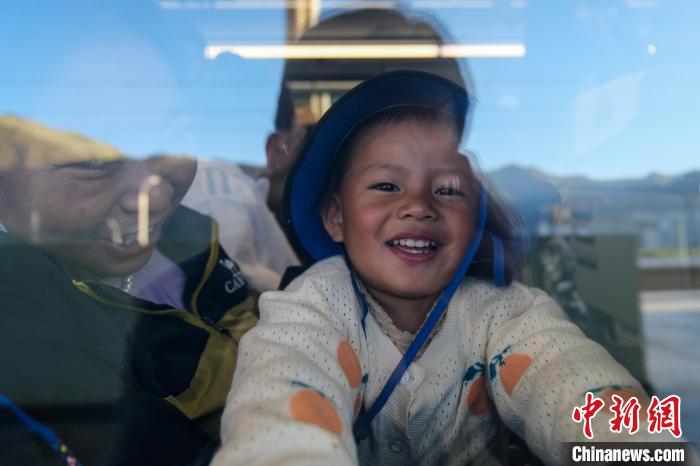 8月16日,西藏拉日鐵路通車十周年。作為連接拉薩與日喀則間的高原城際鐵路,十年來,拉日鐵路運送旅客超1429萬人次,運送貨物超524萬噸。圖為16日,一位小乘客搭乘C885次動車組列車前往日喀則。中新社記者 江飛波 攝