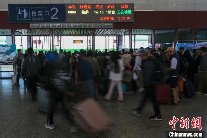 8月16日,西藏拉日鐵路通車十周年。作為連接拉薩與日喀則間的高原城際鐵路,十年來,拉日鐵路運送旅客超1429萬人次,運送貨物超524萬噸。圖為16日,西藏拉日鐵路日喀則站內(nèi),旅客檢票乘車前往拉薩。中新社記者 江飛波 攝