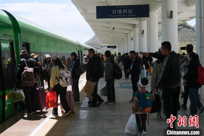 8月16日,西藏拉日鐵路通車十周年。作為連接拉薩與日喀則間的高原城際鐵路,十年來,拉日鐵路運送旅客超1429萬人次,運送貨物超524萬噸。圖為16日下午,乘客在拉日鐵路日喀則站搭乘C888次高原復興號動車組前往拉薩。中新社記者 江飛波 攝