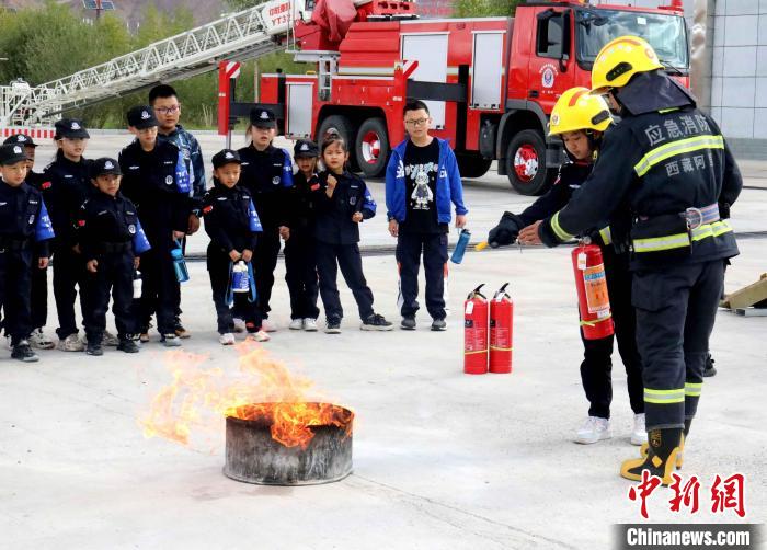 圖為消防員指導(dǎo)孩子們使用滅火器滅火。徐家麗 攝