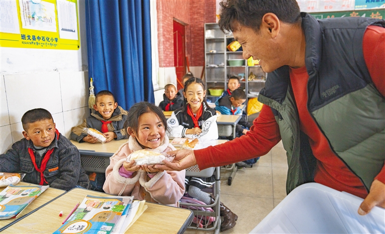西藏那曲市班戈縣中石化小學(xué)是目前全國海拔最高的援藏小學(xué),由中石化集團結(jié)對幫扶建立,2012年投入使用。圖為班戈縣中石化小學(xué)后勤副校長尼旦為學(xué)生們分發(fā)營養(yǎng)餐(資料圖片)。新華社記者 丁增尼達 攝