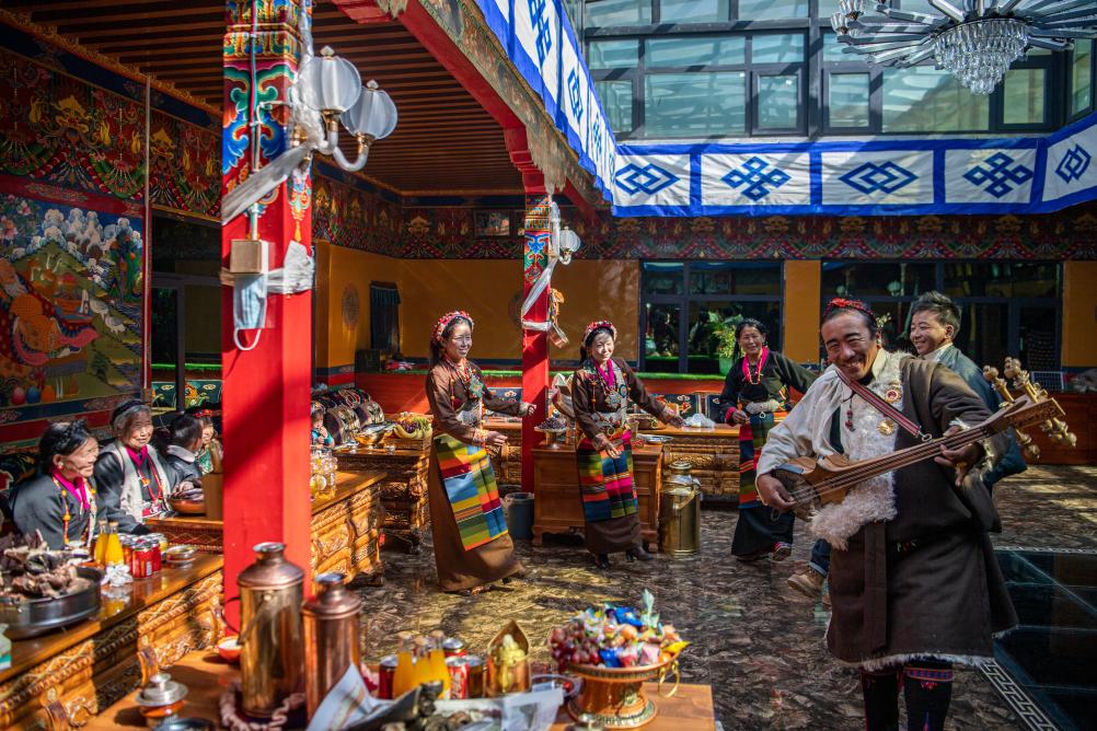 2023年1月22日,在位于西藏日喀則拉孜縣扎西宗鄉(xiāng)雜村的家中,次旦老人的兒孫們一邊彈扎念琴一邊跳舞,慶祝藏歷農(nóng)家年。新華社記者 孫非 攝