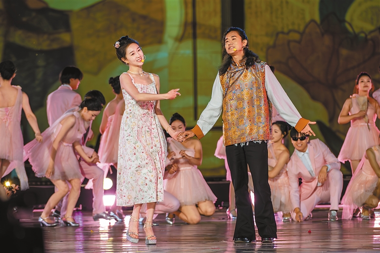 湖南民謠樂隊(duì)與山南搖滾樂隊(duì)帶來全新創(chuàng)作歌曲《雅礱歡歌》。這首歌以湖南童謠《月亮粑粑》和山南童謠為創(chuàng)作基底,兩支青春樂隊(duì)與山南職高的15名吉他手共同奏響青春樂章,“融”出別樣精彩。開幕式晚會將《次仁拉索》和《今天你要嫁給我》進(jìn)行了巧妙的“嫁接”,講述了各民族在交往交流交融中涌現(xiàn)出的愛情故事。