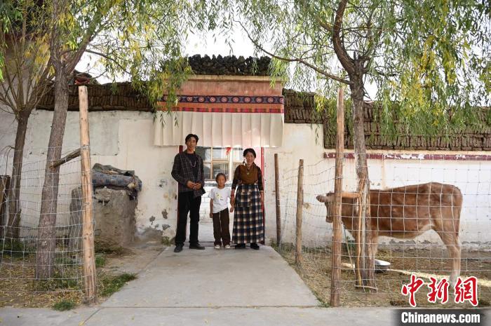 柳果村村民普瓊與家人在自家門(mén)前留影。中新網(wǎng)記者 貢確 攝