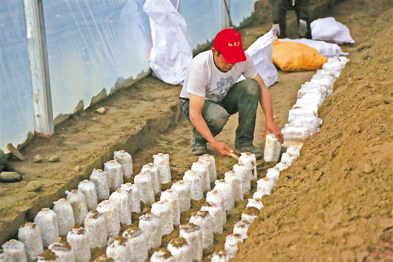 米林市米林鎮(zhèn)紅太陽家庭示范農(nóng)場的工人在埋植林芝靈芝的三級(jí)菌包。記者 謝筱純 攝