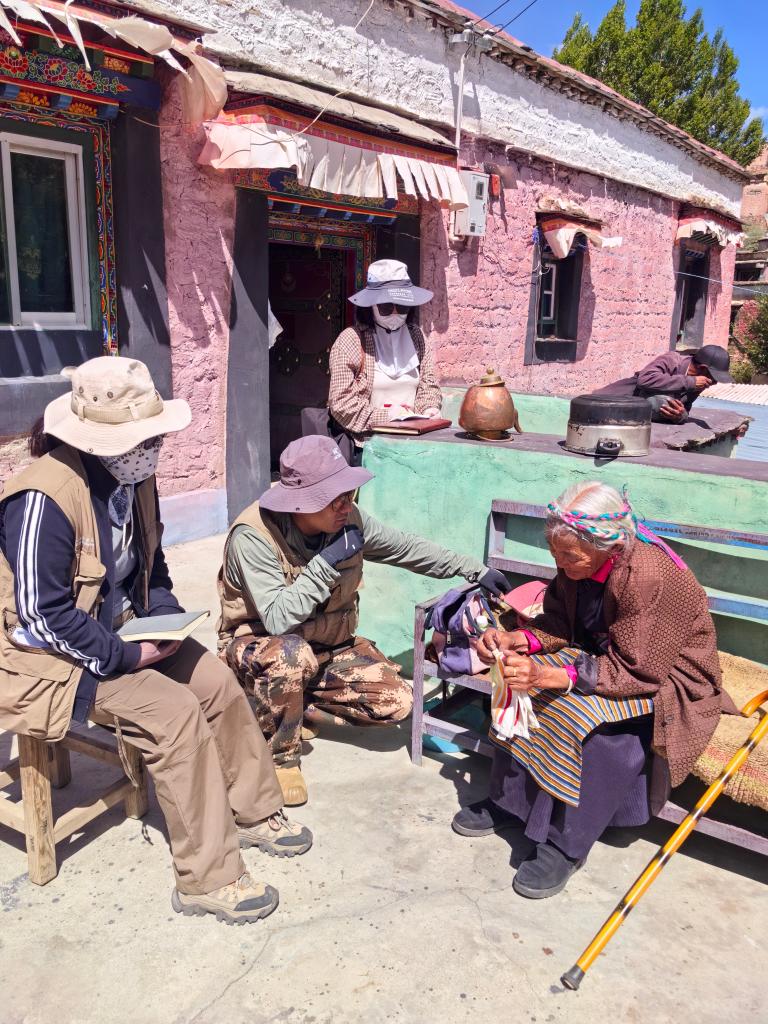 普查隊(duì)員在山南市曲松縣曲松鎮(zhèn)瓊嘎村向當(dāng)?shù)乩先俗稍冊摯鍤v史文化情況。(受訪者供圖)