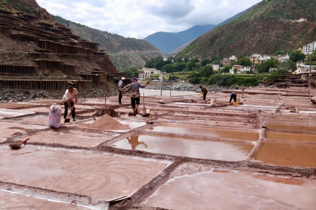 當?shù)卮迕袢员3种嫉氖止覃}方式,他們從瀾滄江畔的鹽井、鹽池中取出鹵水倒入鹽田,經(jīng)陽光蒸曬、風干,結(jié)晶成鹽。遠遠望去,鹽田錯落有致,景色奇美。