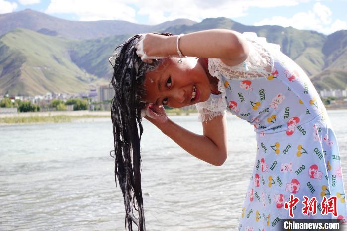 不少兒童在大人的看護(hù)下嬉戲玩水,9歲的強(qiáng)久措姆說(shuō):“我覺得在河邊洗澡特別有趣,能夠更好地親近大自然,還可以過(guò)林卡。”