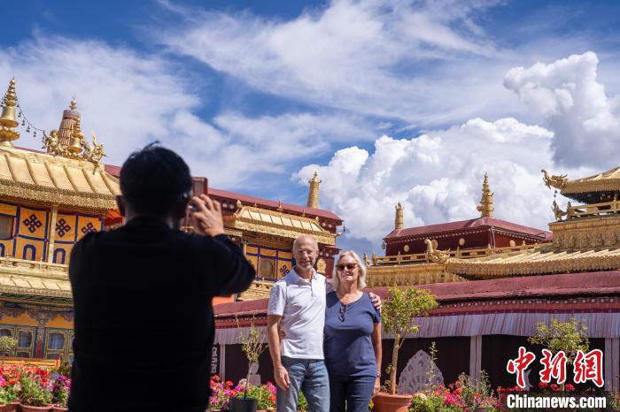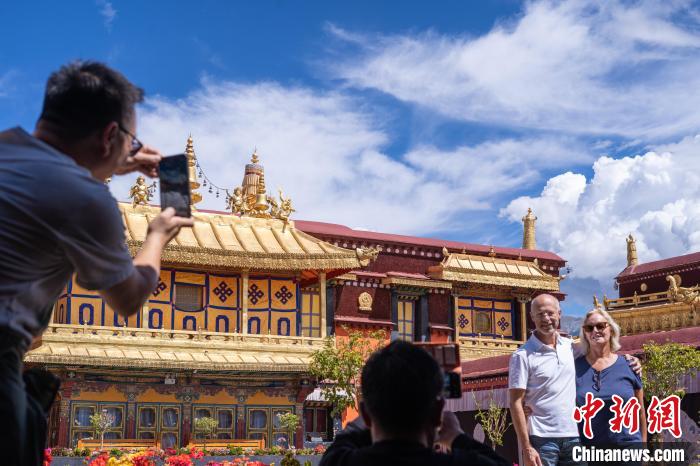 9月17日,外國游客在西藏拉薩大昭寺合影留念。中秋佳節(jié),距今已有1300多年歷史、2000年作為布達拉宮擴展項目列入《世界遺產名錄》的拉薩大昭寺迎來眾多游客。中新社記者 貢嘎來松 攝
