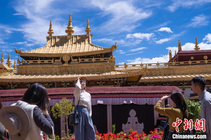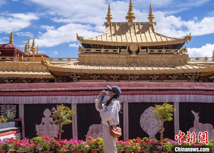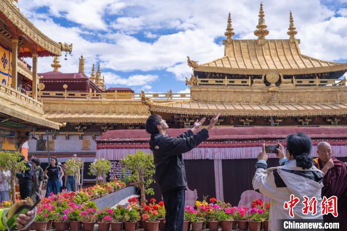 9月17日,游客在西藏拉薩大昭寺金頂前留影。中秋佳節(jié),距今已有1300多年歷史、2000年作為布達拉宮擴展項目列入《世界遺產名錄》的拉薩大昭寺迎來眾多游客。中新社記者 貢嘎來松 攝