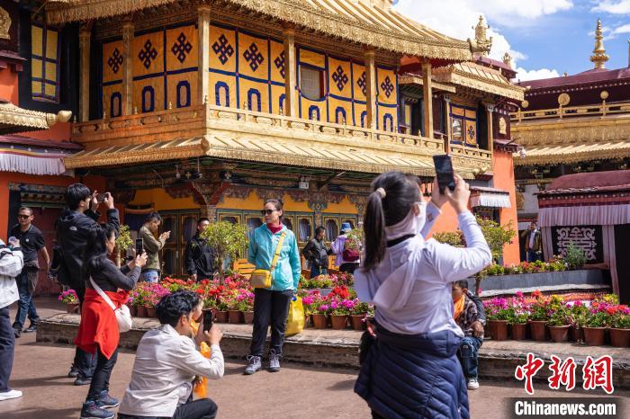 9月17日,游客在西藏拉薩大昭寺拍攝藏服寫真。中秋佳節(jié),距今已有1300多年歷史、2000年作為布達拉宮擴展項目列入《世界遺產名錄》的拉薩大昭寺迎來眾多游客。中新社記者 貢嘎來松 攝
