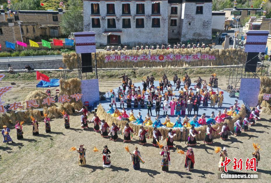 9月22日,2024年西藏“中國(guó)農(nóng)民豐收節(jié)”慶?;顒?dòng)在山南市瓊結(jié)縣拉玉鄉(xiāng)強(qiáng)吉村舉行。活動(dòng)以“學(xué)用‘千萬(wàn)工程’禮贊豐收中國(guó)”為主題,由西藏各地(市)民間演出隊(duì)為大家獻(xiàn)上一場(chǎng)具有地域特色、體現(xiàn)農(nóng)牧民豐收喜悅的歌舞盛宴。圖為演出現(xiàn)場(chǎng)。(無(wú)人機(jī)照片)