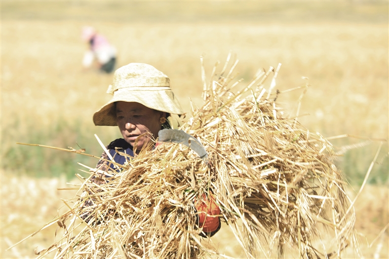 金秋九月,風(fēng)吹麥浪、穗粒飽滿,連日來,在墨竹工卡縣金黃色的農(nóng)田里,處處可見勤勞的農(nóng)民們搶抓時(shí)機(jī),開展小油菜和青稞收割、晾曬、搬運(yùn)、儲藏,確保糧食顆粒歸倉。