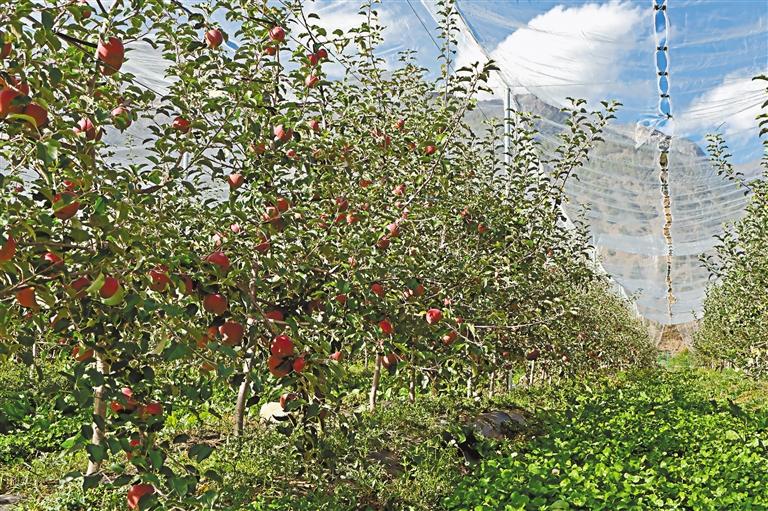矮砧寬行密植的蘋(píng)果樹(shù)被劃分成一個(gè)個(gè)區(qū)域?!斑@是我們的多功能網(wǎng)室,是一種以高密度聚乙烯為主料的防護(hù)網(wǎng)。能抗大風(fēng),減少冰雹、暴曬等惡劣天氣帶來(lái)的影響。”增巴村蘋(píng)果種植基地技術(shù)員劉傳海介紹道。