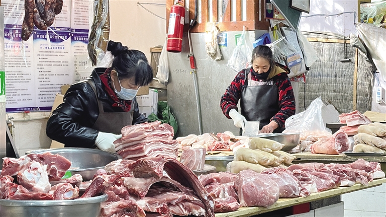立冬過后,拉薩“菜籃子”“果盤子”產(chǎn)品購(gòu)銷兩旺的同時(shí),肉類產(chǎn)品作為市民餐桌上的硬菜,也備受市民歡迎。在拉薩市城關(guān)區(qū)明生菜市的肉類售賣區(qū),記者看到每個(gè)肉攤上擺放著不同的肉品,攤主們忙著割肉稱重,不少市民正在仔細(xì)選購(gòu)?!白罱鞖饫淞耍匀饪梢栽黾訜崃?,多買點(diǎn)回去凍起來(lái)慢慢吃。”正在挑選牛肉的拉薩市民張女士笑著說(shuō),“這里的肉品新鮮,價(jià)格也合理,我經(jīng)常來(lái)這里買肉?!?/p>