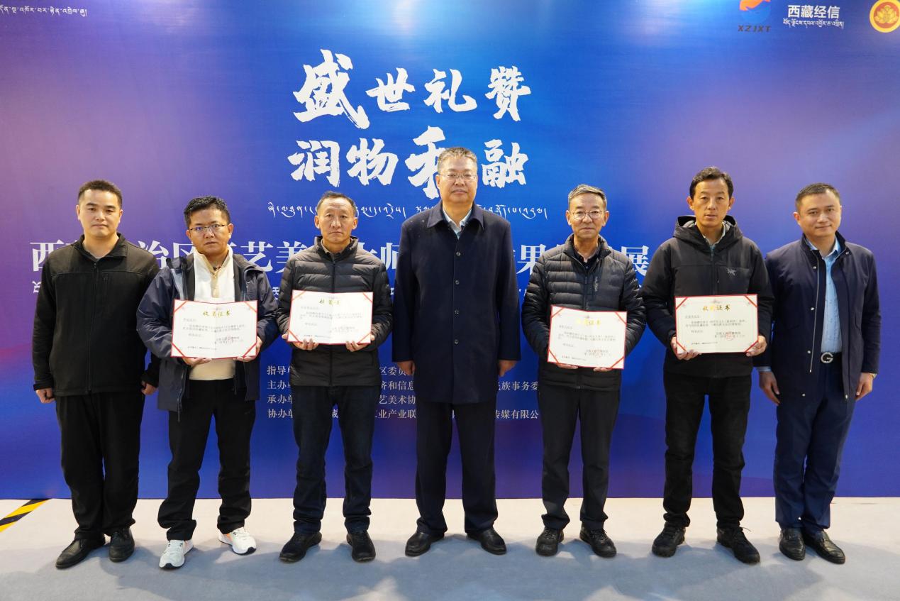 “西藏自治區(qū)工藝美術(shù)大師評選成果作品展”由西藏自治區(qū)經(jīng)濟和信息化廳、西藏自治區(qū)民族事務(wù)委員會聯(lián)合主辦,于2024年11月7日在民族文化宮展出。本次捐贈作品為“西藏自治區(qū)工藝美術(shù)大師評選成果作品展”中的5件代表性精品力作,包括唐卡作品《格薩爾王》(復(fù)制件)(作者:貢覺杰)、《文成公主建小昭寺》(復(fù)制件)(作者:羅布斯達)、《一枝一葉總關(guān)情》(復(fù)制件)(作者:珠木巧),堆繡作品《金絲野牦?!罚ㄗ髡?晉美洛追)、《石榴籽》(作者:晉美洛追)。任毅同志向作者頒發(fā)了收藏證書,并表示誠摯感謝。