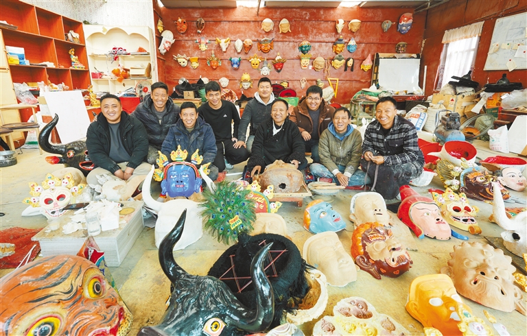 在拉薩市達(dá)孜區(qū)雪鄉(xiāng)民間傳統(tǒng)手工藝農(nóng)民專業(yè)合作社的小院里,拉薩布制面具制作技藝西藏自治區(qū)級(jí)非遺傳承人西洛和徒弟們忙得熱火朝天,他們正在制作面具。面具制作工序繁雜,制作一個(gè)面具包括雕刻、分層、風(fēng)干和噴漆等十幾道工序。2012年,在政府的扶持下,西洛創(chuàng)辦了傳統(tǒng)手工藝合作社,主要制作和銷售藏戲面具。西洛制作的面具造型精美,廣泛運(yùn)用于藏戲表演中?!懊婢叩膬r(jià)格從幾百元到幾萬元不等,大部分訂單來自西藏的各大藏戲團(tuán)?!蔽髀逭f。近年來,合作社不斷吸納當(dāng)?shù)厝罕妼W(xué)習(xí)面具制作技藝,不僅為當(dāng)?shù)厝罕娞峁┚蜆I(yè)機(jī)會(huì),也進(jìn)一步助力非物質(zhì)文化遺產(chǎn)的保護(hù)和發(fā)展。