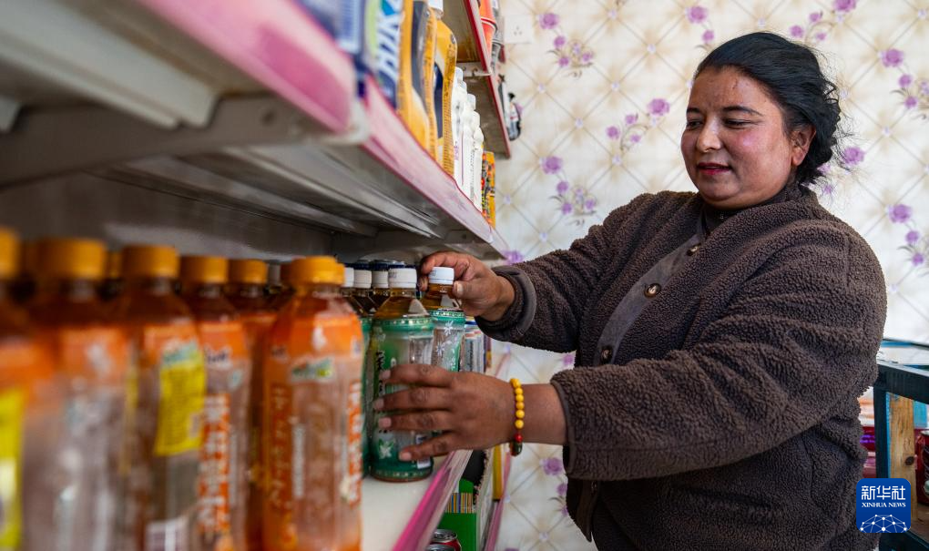 12月15日,一名達曼新村的婦女在自家商店里整理貨架。新華社記者 丁增尼達 攝