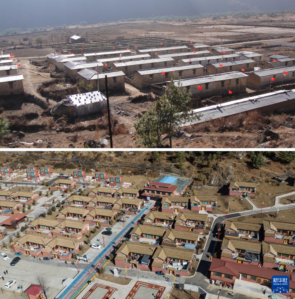拼版照片,上圖為:2005年拍攝的達曼新村(新華社發(fā));下圖為:2024年12月15日拍攝的達曼新村(無人機照片,新華社記者丁增尼達攝)。新華社發(fā)