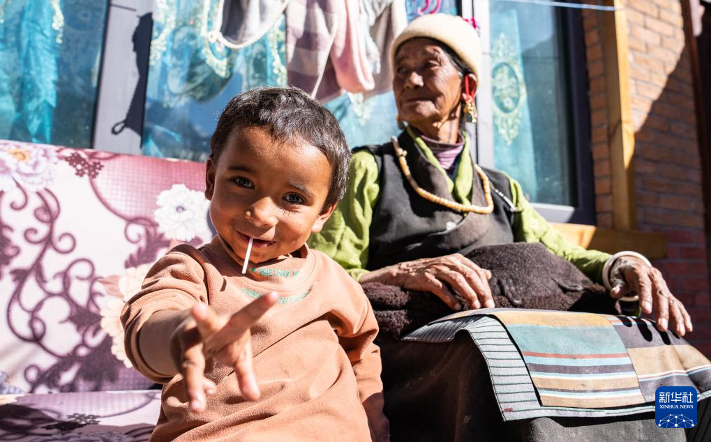 12月15日,達曼新村的孩子和老人在曬太陽。新華社記者 丁增尼達 攝