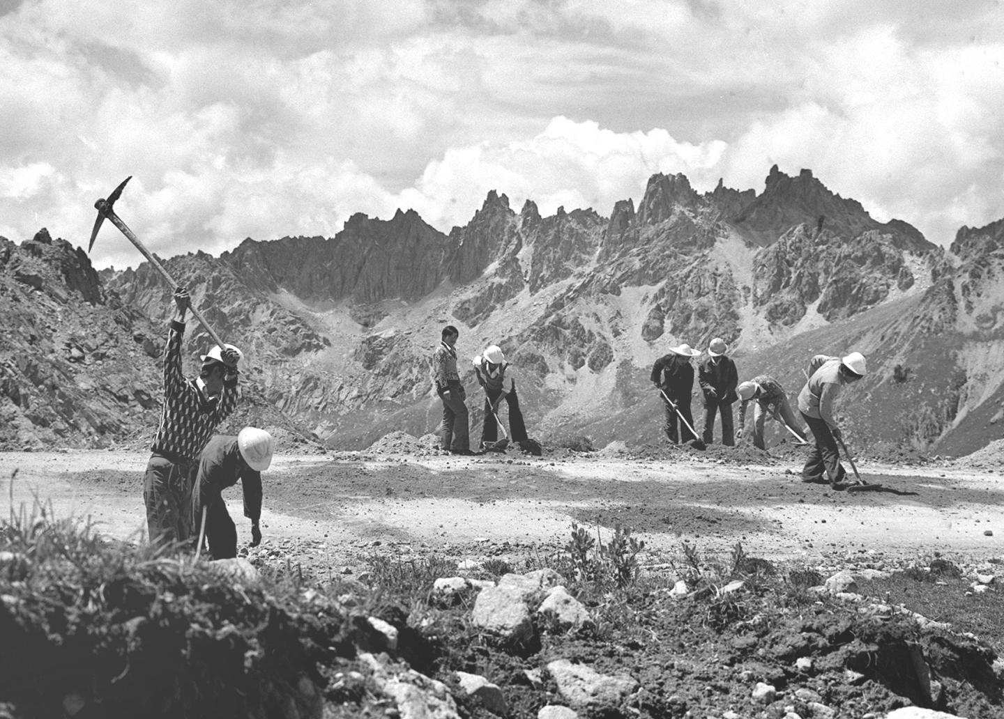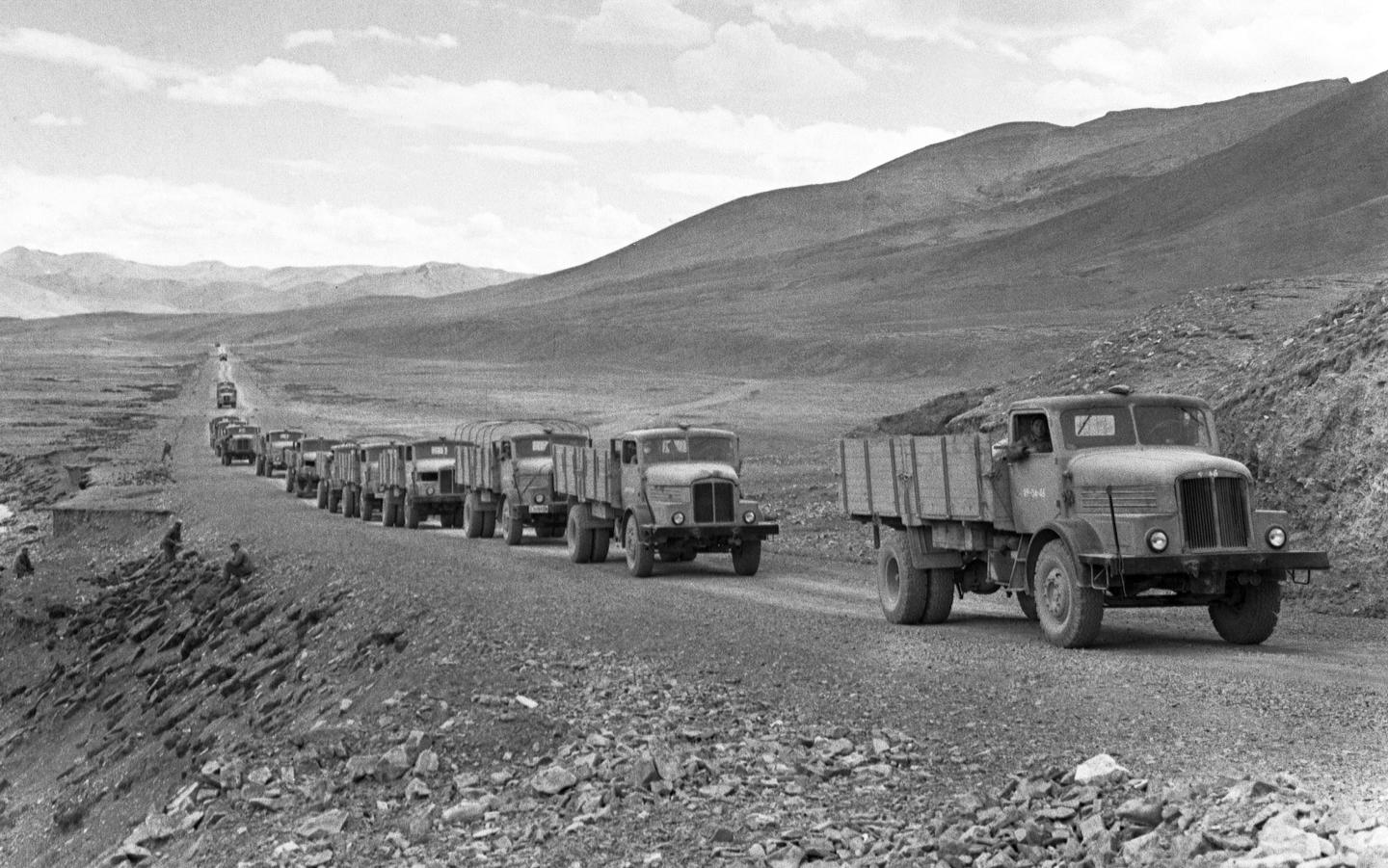 1964年,滿載建設(shè)物資的汽車隊行駛在川藏公路途中的雀兒山上。