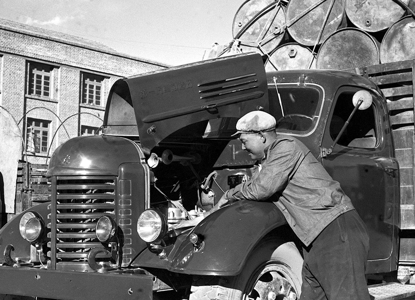 1964年,曾經(jīng)是川藏公路筑路工人的汽車駕駛員呷瑪卻桑在出車前對汽車機件進行檢查。