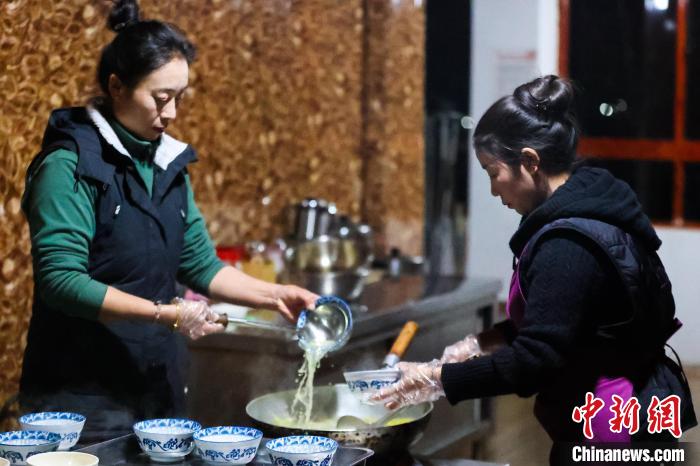 12月20日,西藏芒康,果拉卓瑪(左)在為食客盛加加面。中新社記者 薛蒂 攝