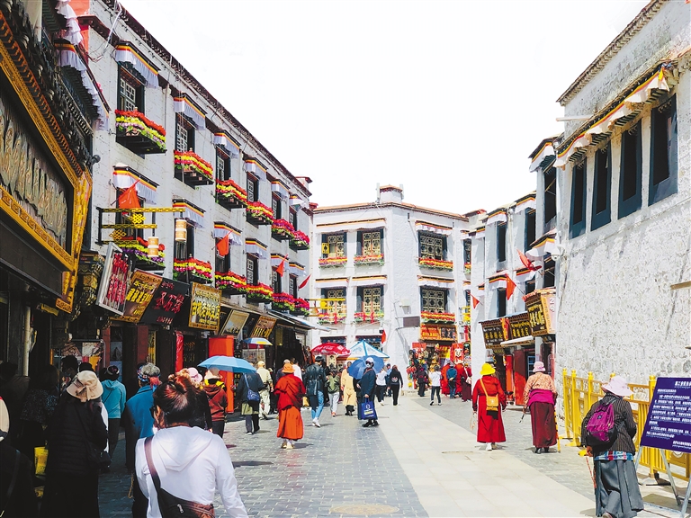如今的八廓街,已成為獨(dú)具民族特色和魅力的傳統(tǒng)文化街區(qū),吸引著來自各地的游客。正如來自武漢的游客李玥所說:“西藏是一生必來之地,我們在老家舉辦完婚禮后,將蜜月旅行地選在了日光之城拉薩。走進(jìn)八廓街,仿佛穿越了時空的隧道,色彩斑斕的建筑,每一座建筑都在訴說著古老的故事。八廓街,有著不同的顏色、不同的人文、不同的語言、不同的建筑、不同的穿著,一切都是那么的不同。”