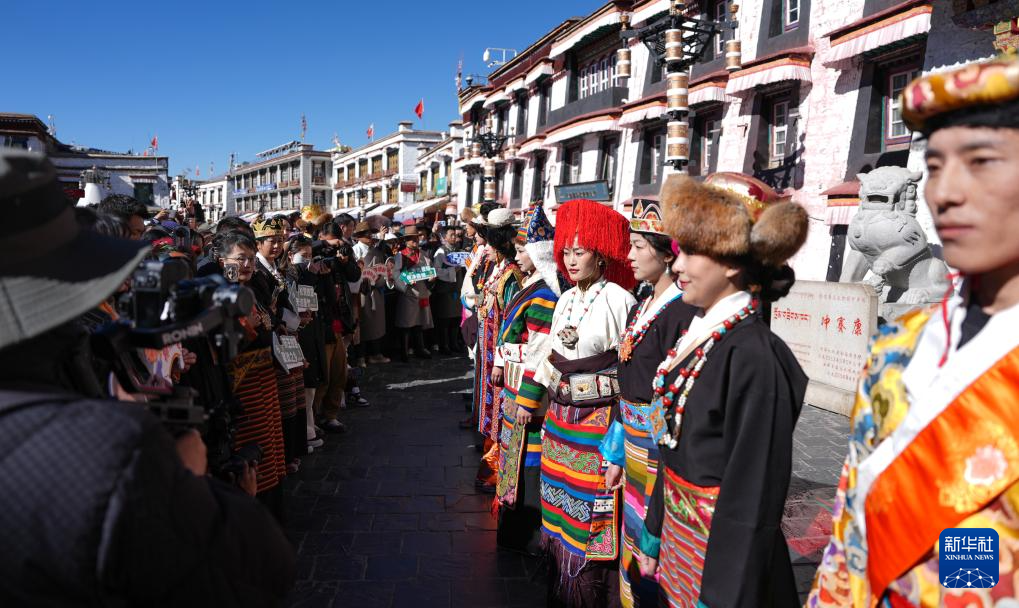 作為拉薩市文化和旅游局主辦的“繁飾自然·衣彩拉薩——拉薩新年服飾秀”群眾文化活動(dòng)的一部分,1月3日,穿著傳統(tǒng)藏裝的模特巡游在拉薩八廓街。
