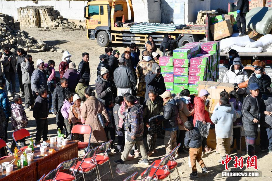 1月9日,西藏自治區(qū)定日縣曲洛鄉(xiāng)措昂村安置點,愛心企業(yè)為受災民眾發(fā)放生活物資。當日,位于西藏自治區(qū)定日縣曲洛鄉(xiāng)措昂村安置點,西藏各級救援人員和愛心企業(yè)不斷轉運、發(fā)放生活物資、搭建安置活動板房、全力保障受災民眾的飲食供應等,保障受災民眾基本生活。中新社記者 貢嘎來松 攝