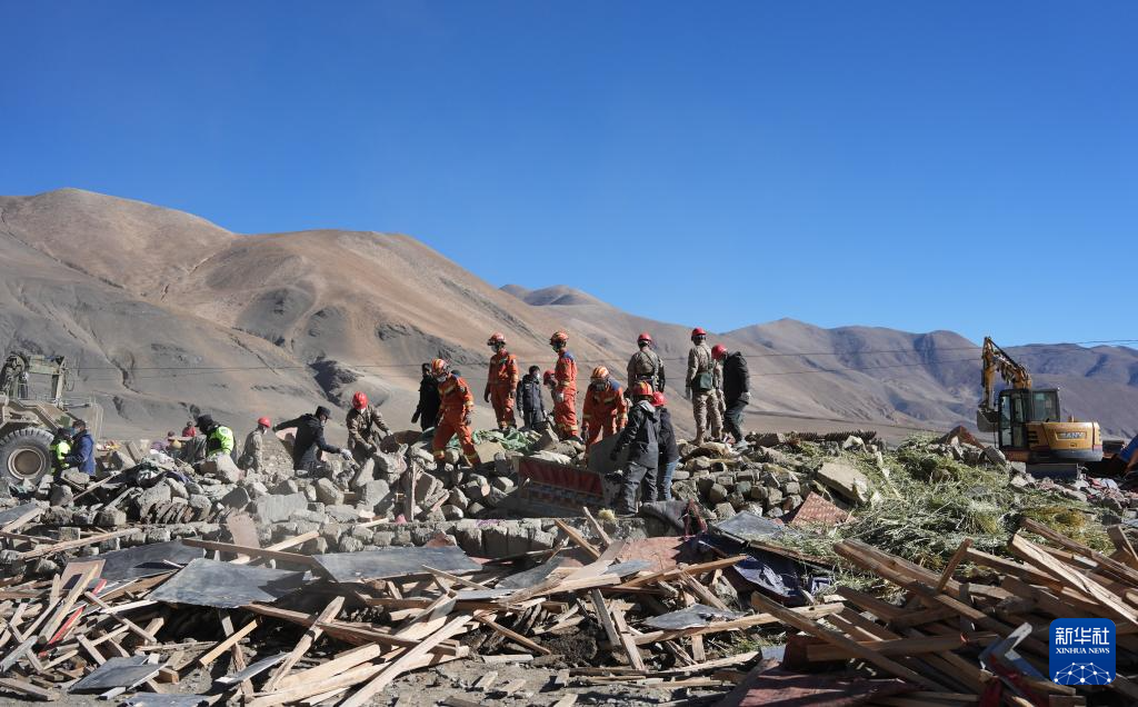 1月10日,救援人員在定日縣長所鄉(xiāng)古榮村清理震后廢墟。新華社記者 沈伯韓 攝