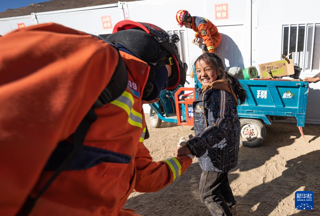在定日縣措果鄉(xiāng)野江村,一個(gè)小女孩在和消防員掰手腕(1月13日攝)。新華社記者 丁增尼達(dá) 攝