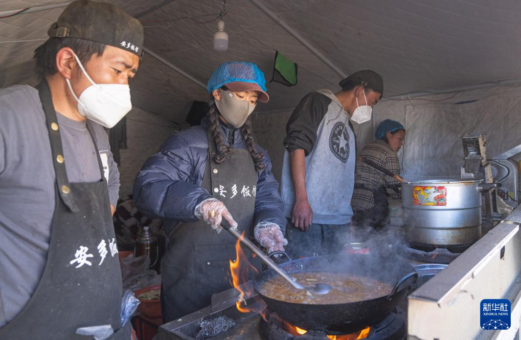 在定日縣長(zhǎng)所鄉(xiāng)古榮村,定日安多飯館的廚師在為群眾做面片(1月13日攝)。新華社記者 丁增尼達(dá) 攝