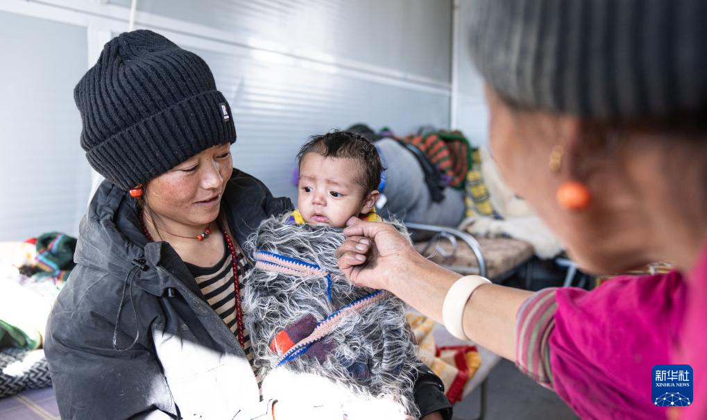在定日縣長(zhǎng)所鄉(xiāng)嘎旦村的活動(dòng)板房里,一位老人在逗孫子開心(1月13日攝)。新華社記者 丁增尼達(dá) 攝