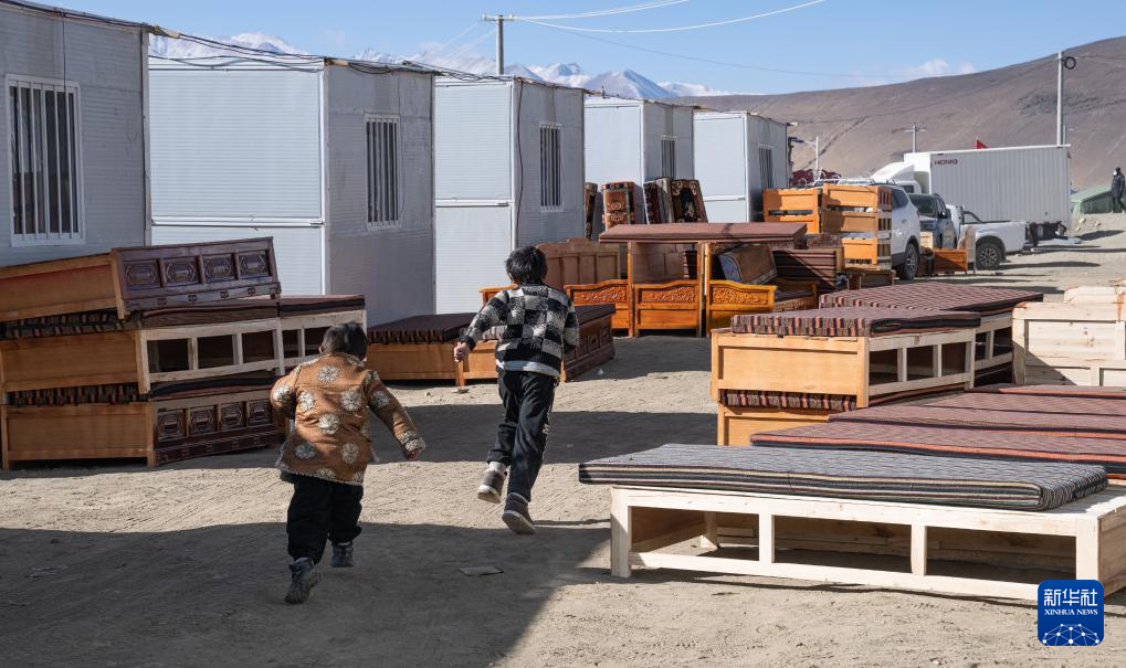 在定日縣長(zhǎng)所鄉(xiāng)嘎旦村,兩個(gè)孩子在剛運(yùn)來(lái)的兩排藏床間奔跑(1月13日攝)。新華社記者 丁增尼達(dá) 攝