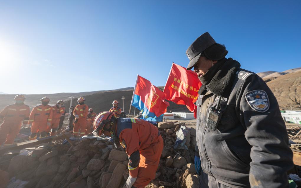 1月13日,在定日縣長(zhǎng)所鄉(xiāng)古榮村,邊巴桑珠(右一)在指揮房屋廢墟清理工作。新華社記者丁增尼達(dá) 攝