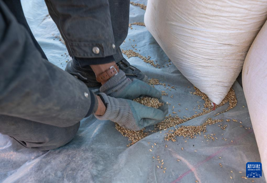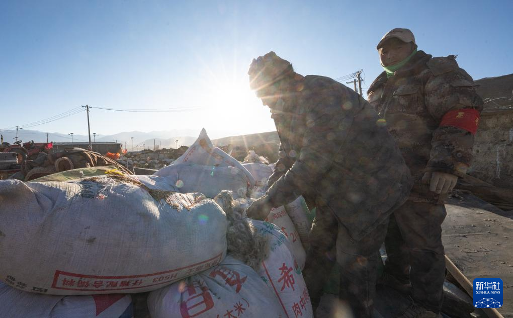 1月13日,在定日縣長(zhǎng)所鄉(xiāng)古榮村,定日縣民兵在搬運(yùn)青稞。新華社記者 丁增尼達(dá) 攝
