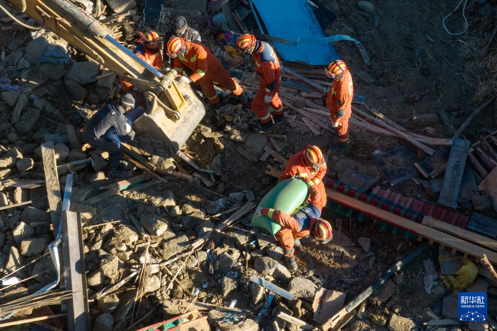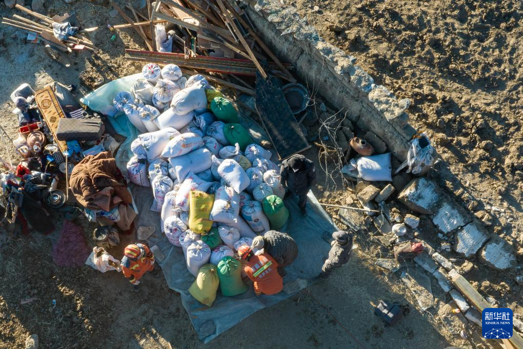 1月13日,在定日縣長(zhǎng)所鄉(xiāng)古榮村,消防員們?cè)诎徇\(yùn)從次仁扎西老人家里搶救出的青稞。新華社記者 丁增尼達(dá) 攝