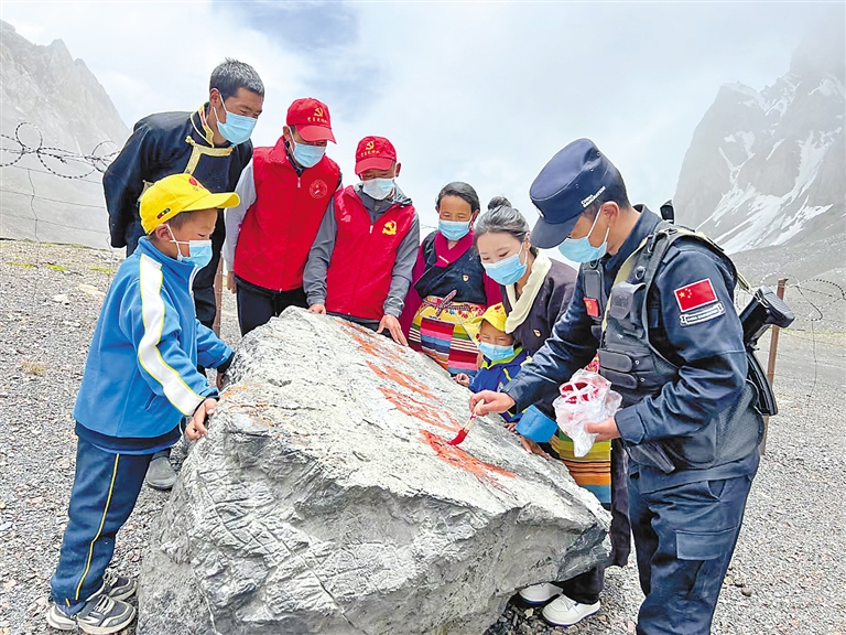 拉青拉山口是吉隆縣貢當鄉(xiāng)境內(nèi)4座通外山口之一,也是中尼傳統(tǒng)邊貿(mào)通道,地形條件極其復雜。李錦一介紹,為增強黨員干部、邊境群眾和社會各界對國家安全、邊境穩(wěn)定的關(guān)心關(guān)注,貢當鄉(xiāng)創(chuàng)新思路開展“國旗插在最前沿 我為祖國守邊關(guān)”系列活動?;顒佣ㄆ谘埲温毟刹?、返鄉(xiāng)探親干部、休假返鄉(xiāng)軍人、節(jié)假日在鄉(xiāng)學生等一同參與界樁描紅、同升國旗、邊境巡邏等各類活動,讓更多人參與到守護邊疆的行動中來。