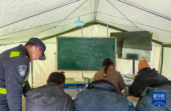 “大家看一下這道題怎么解?”在西藏日喀則市定日縣長所鄉(xiāng)嘎布村安置點的帳篷內,22歲的劉鑫磊一手指著黑板上的題目,一手拿著資料,耐心地給村里的高三學生講解。