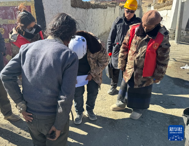 1月13日,次旺(右一)陪同工作組走訪村莊,評估房屋受損程度。新華社記者 格桑邊覺 攝