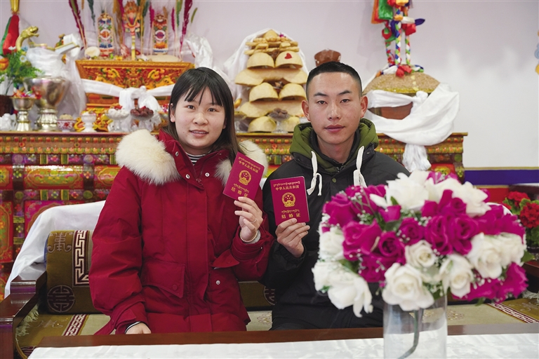“我們?cè)谝黄?年了,是表姐牽的紅線?!钡┰龈峦吣樕涎笠缰腋5男θ荩従徴f(shuō)道,“初次見(jiàn)到卓嘎,我就對(duì)她心生好感。相處一段時(shí)間后,我發(fā)現(xiàn)她性格溫柔,和我特別合拍,于是鼓起勇氣向她表白?!彼_(kāi)心地展示著剛剛領(lǐng)到的結(jié)婚證,“情人節(jié)是個(gè)好日子,我們?cè)缇陀?jì)劃好今天領(lǐng)證,現(xiàn)在終于如愿以償。以后情人節(jié)和結(jié)婚紀(jì)念日合二為一,既能少買(mǎi)一份禮物,也不用擔(dān)心忘記啦。”