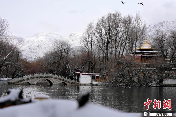 2月19日,西藏拉薩經(jīng)過持續(xù)降雪,城市四周白雪皚皚。雪山、建筑相映成景、風(fēng)光秀麗。圖為2月19日,雪后宗角祿康公園。中新社記者 李林 攝