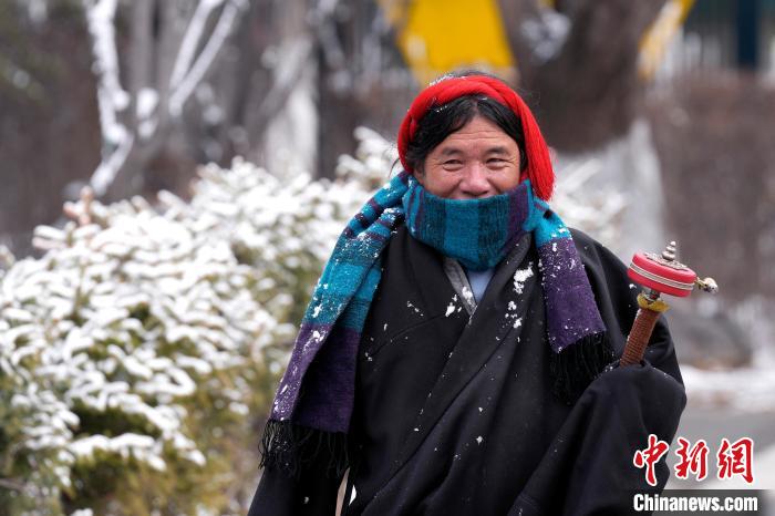 2月19日,西藏拉薩經(jīng)過持續(xù)降雪,城市四周白雪皚皚。雪山、建筑相映成景、風(fēng)光秀麗。圖為2月19日,信眾在雪后的宗角祿康公園轉(zhuǎn)經(jīng)。中新社記者 李林 攝