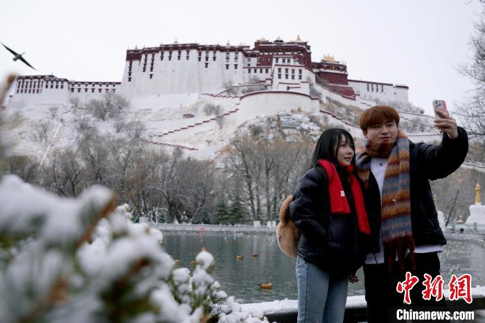 2月19日,西藏拉薩經(jīng)過持續(xù)降雪,城市四周白雪皚皚。雪山、建筑相映成景、風(fēng)光秀麗。圖為2月19日,游客在布達(dá)拉宮腳下的宗角祿康公園拍照留念。中新社記者 李林 攝