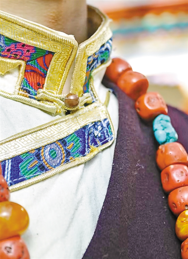 男士們大多身著用家織氆氌制作的藏袍,以黑、白色為主,領口、袖口、下擺等位置鑲嵌著精美的“十”字紋花邊。他們頭戴金花帽,腳穿“松巴”鞋,整個裝扮既展現了高原男子的粗獷與豪放,又透露出一種對細節(jié)的極致追求。女士們的服飾則更加豐富多彩,她們穿著黑色氆氌藏袍,內搭彩色襯衫,系著彩虹條紋的“邦典”,已婚女子還會將各色絲線編入頭發(fā)中形成發(fā)辮,恰似高原上綻放的花朵。